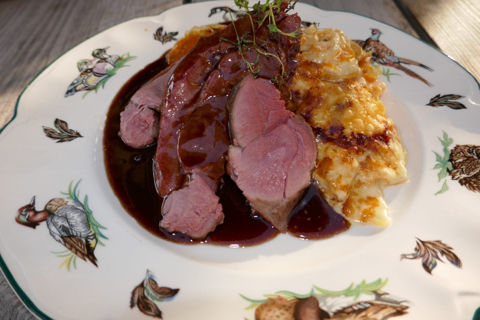 Reinsdyrmørbrad med bønner, fløtegratinerte poteter og madeirasaus