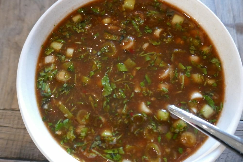 Bland alle ingrediensene til sausen og la den stå i minst 20 minutter i romtemperatur.