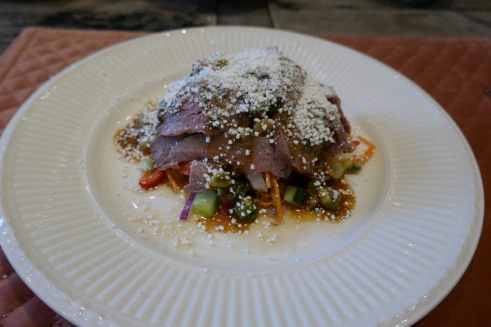 Crying tiger er en tradisjonell thailandsk oppskrift av marinert oksekjøtt servert på en salatseng og med et dryss med ristet rispulver.
