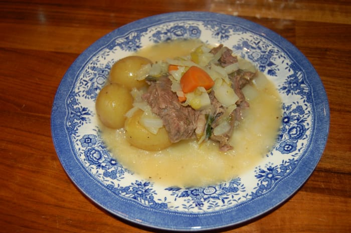 Kok opp 1,5 vann og legg i kjøttet med bein i så hele stykker som mulig. Kok opp igjen og skum godt av. Dryss over salt og legg i det grønne av purren, finstrimlet. La det trekke under lokk til kjøttet er mørt, ca. 2,5 – 3 timer. Gulrøtter, sellerirot og persillerot skrelles og deles i terninger. 150 g hodekål strimles fint. Tilsett alle grønnsakene i gryta og la alt trekke til det er mørt, i ca. 10 minutter. Smak til med salt og pepper.
