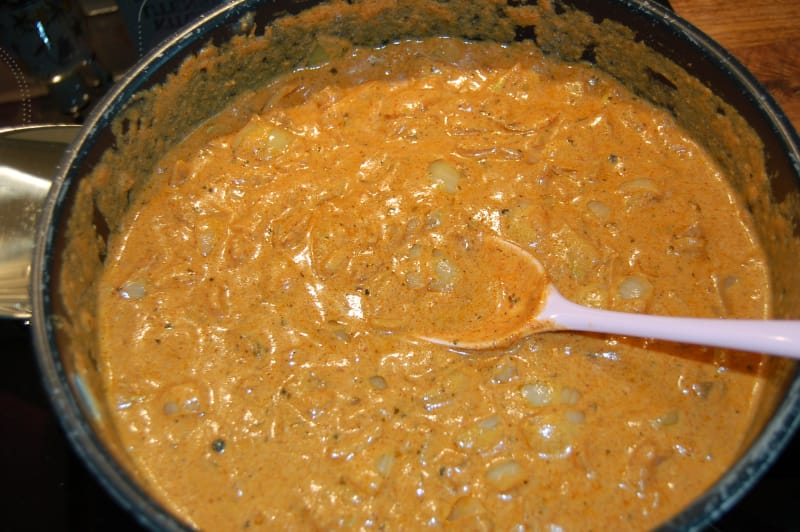 Smelt ghee (eller smør) i en gryte. Tilsett løk og fres den til den blir gyllen, myk og litt karamellisert. Tilsett hvitløk, ingefær, garam masala, paprikapulver og chilipulver. La det frese videre i ett minutt under omrøring.