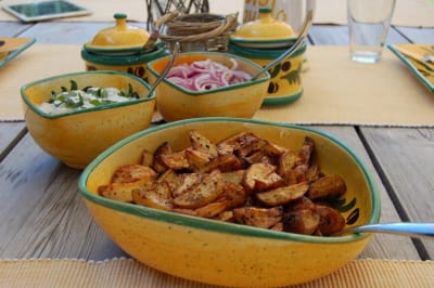 Bordet er dekket med et servise vi har tatt med oss fra en keramiker i Spania.