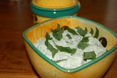 Blandes og smakes til med finhakket mynte, hvitløk, pepper og sitron. Tzatzikien blir bare bedre av å få stå i kjøleskapet i noen timer.