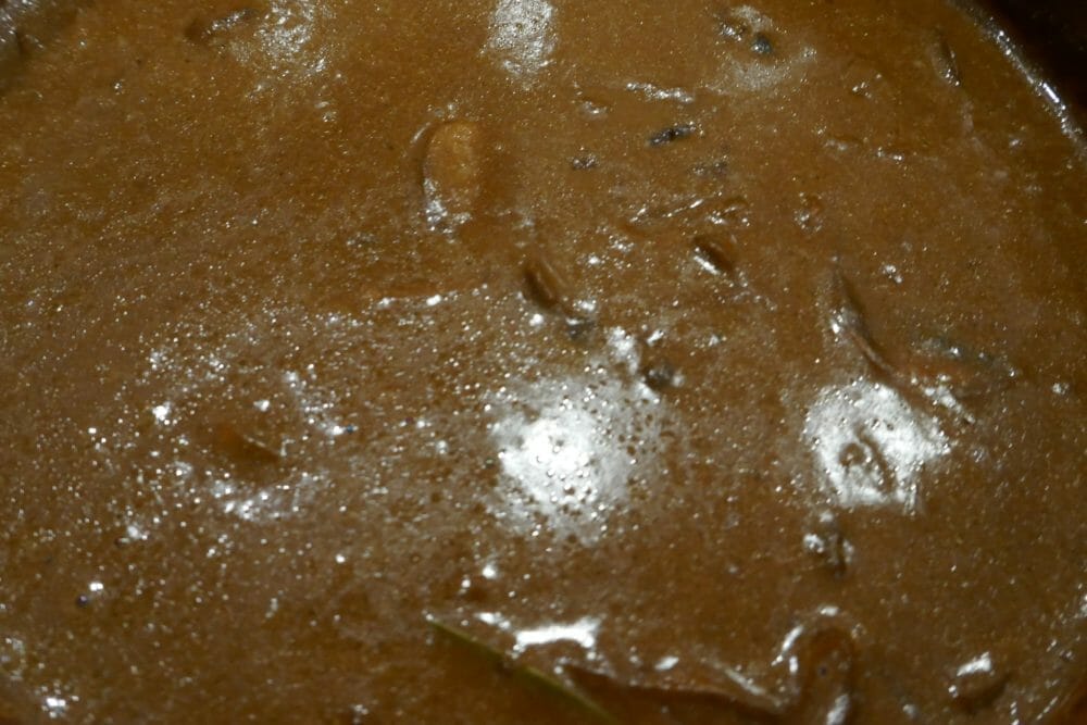 Brun løk og sopp i smør. Tilsett mel og spe med melk, mens du rører. Tilsett resten av ingrediensene og la det koke noen minutter. Plukk ut laurbærbladene før servering.