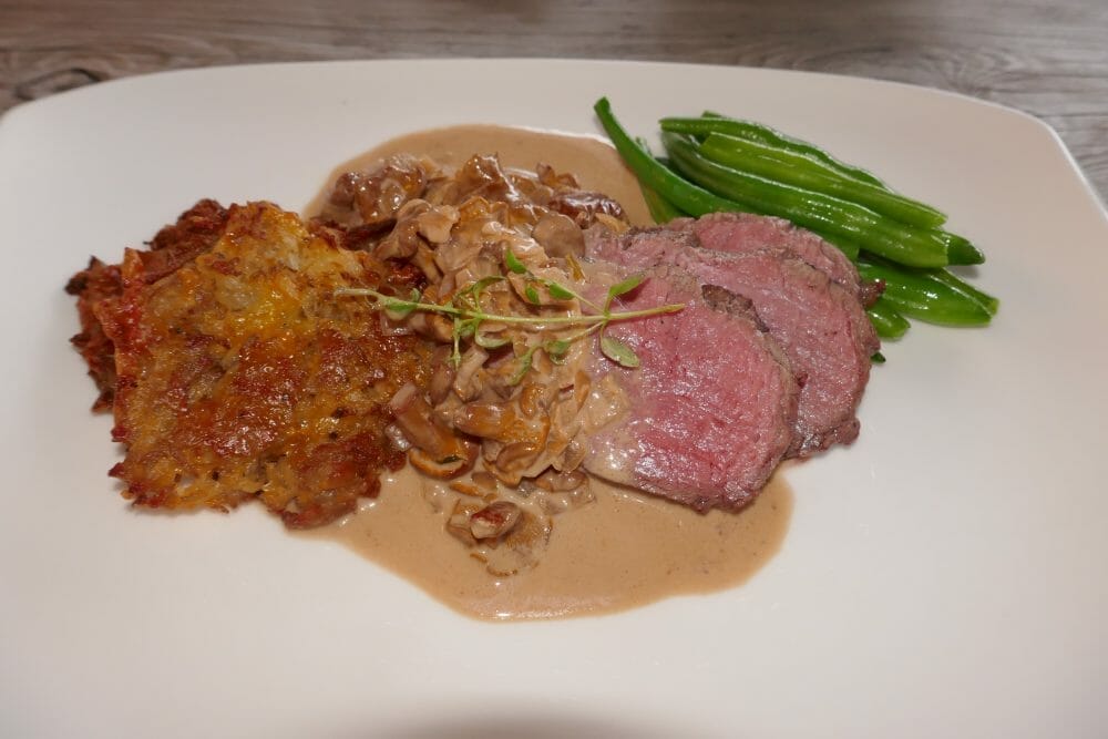 Server indrefilet med rösti (røsti) og kantarellsaus med valgfrie grønnsaker. Jeg har brukt bønner fra egen avling, som jeg har renset og deretter gitt en kjapp kok i en blanding av smør og vann. De smaker best når det fortsatt er tyggemotstand i dem.