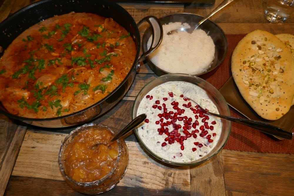 Server laks tikka masala med ris, kokt etter anvisning på pakken, nan, raita og mangochutney.