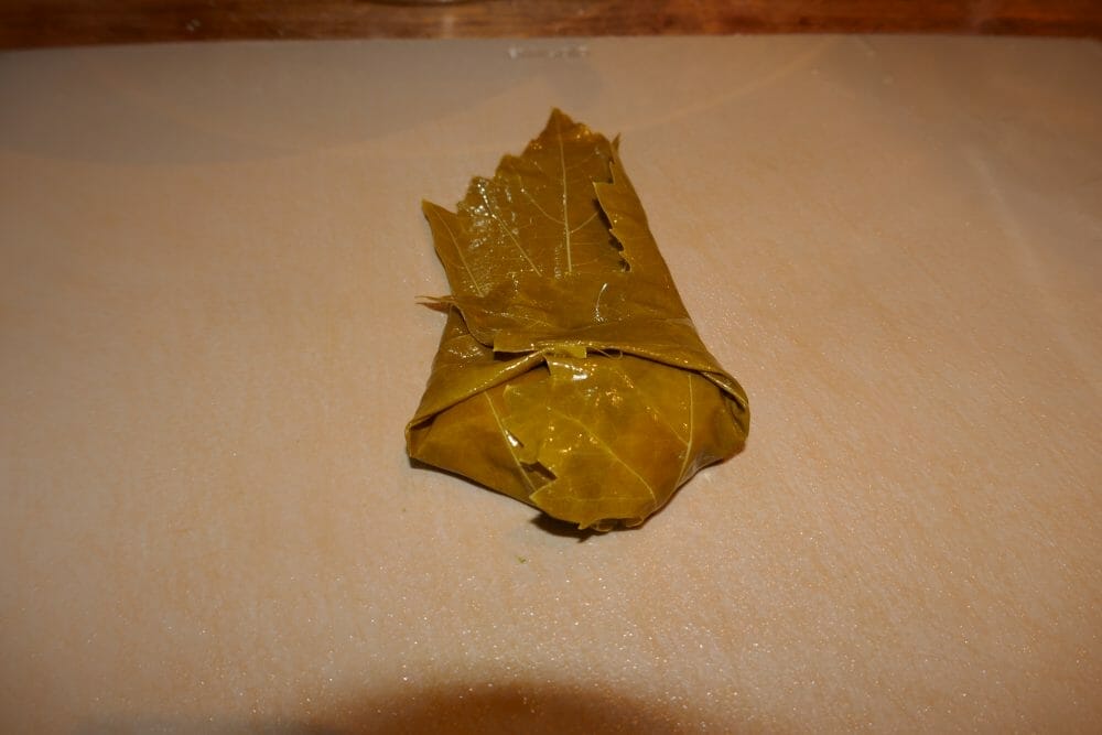 Legg vinbladene med den glatte siden ned, legg på litt av fyllet og brett som vist på bildene.