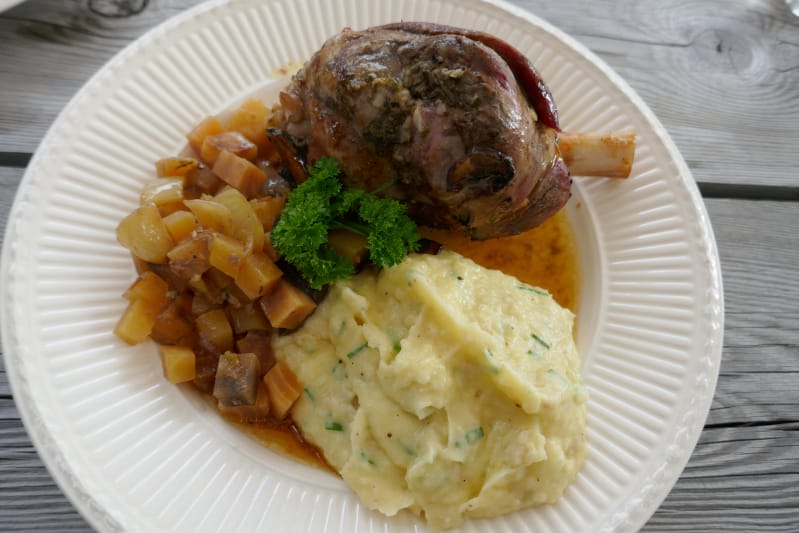 Lammeskanker på en seng av sopp og rotgrønnsaker