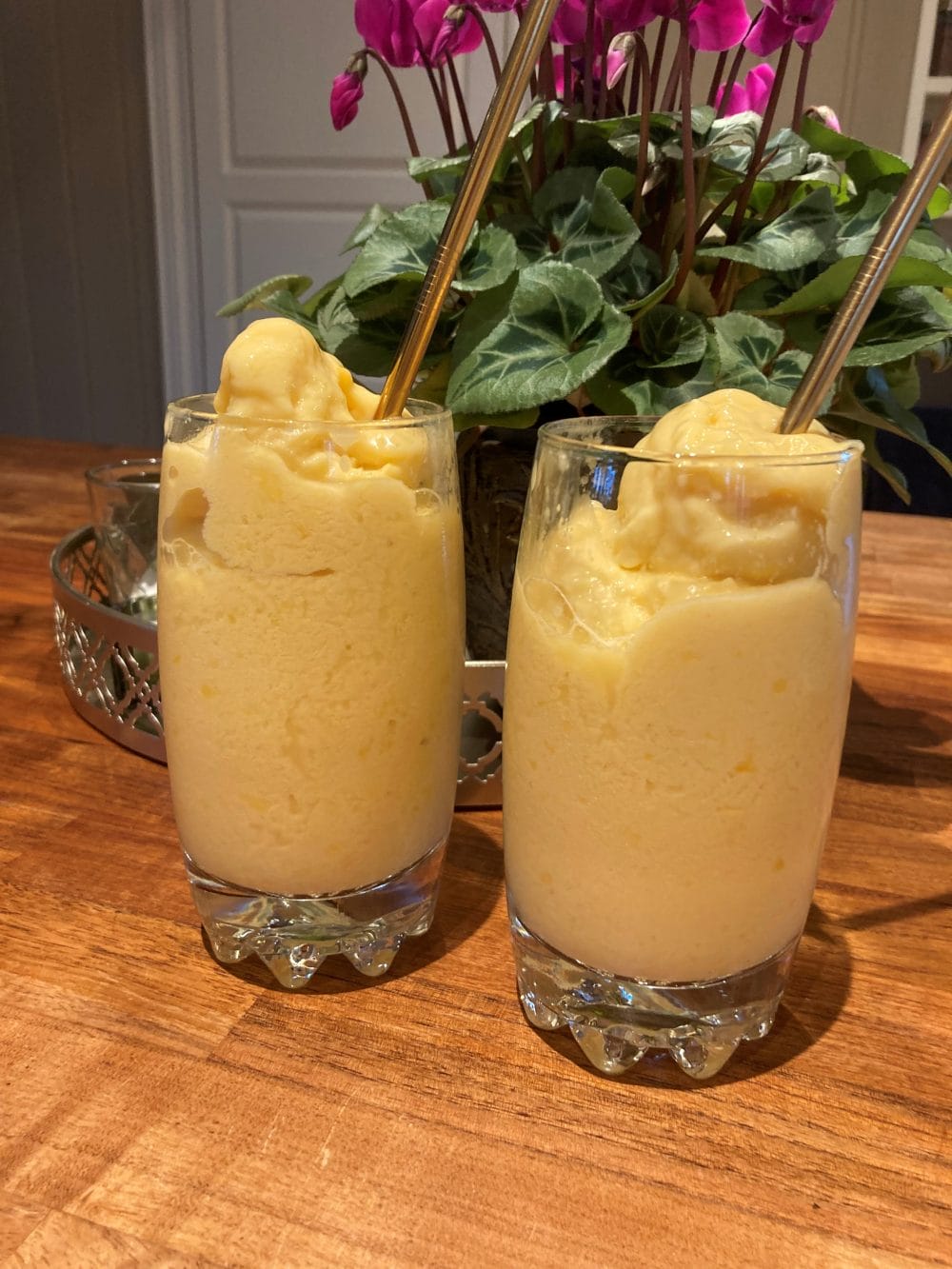 Mangolassi drikkes i India og Pakistan og kan varieres med forskjellige typer krydder, som for eksempel ingefær, kanel, muskat, chili, spisskummen, koriander eller salt. Jeg har laget den med helt naturlige smaker, men det er en enkel sak å variere den, om du ønsker. Siden den inneholder kefir eller kulturmelk, smaker den ekstra godt etter et hot måltid. Om du vil bruke frosne mangoterninger, passer det med 300 g i denne oppskriften.