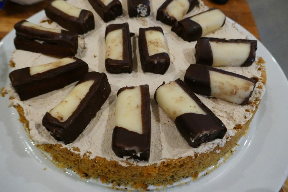 Kremen er laget av 1,5 store bokser med pisket fløte (ikke sukker), smakt til med sjokoladesaus og cream fix, for at den skulle holde seg bedre stiv. Jeg la et tynt lag med krem på den nederste bunnen og deretter la jeg på dessertsnitter, som jeg hadde delt i to, på langs. Så la jeg på litt mer krem, før den øverste kakebunnen ble lagt på. Jeg har sprøytet kremen på kaka og pyntet med franske makroner med vanilje- sjokolade- og kaffesmak. I tillegg la jeg på sjokoladeegg og kakepynt fra Cacas. Tallene er stjerneskudd og skal si det så kult ut, når de ble tent ved bordet.