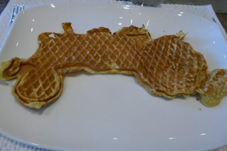 De hvite tallerkenene er fra Villeroy & Boch. Vi bruker de avlange tallerkenene fordi vi steker vaflene i traktorjernet vårt. Du finner vaffeloppskriften HER.