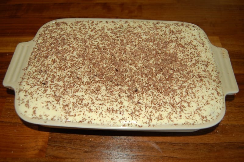 Legg et nytt lag med krem, kjeks som er dyppet i kaffeblandingen oppå og avslutt med et lag krem. Dryss revet kokesjokolade på toppen og avkjøl i minimum 1 time før servering.