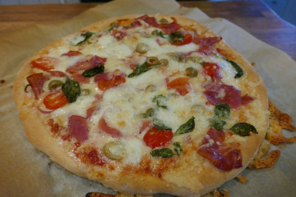 Elt alt godt sammen og la den heve. Deigen er perfekt, når den er så fuktig at du akkurat klarer kjevle eller trykke den ut, så tilsett nok vann. Når jeg lager pizza, lar jeg deigen kose seg i lang tid, gjerne i kjøleskapet natten over. Jeg tar den ut ca. 1 time før jeg skal bruke den og lar den heve seg ferdig på benken.