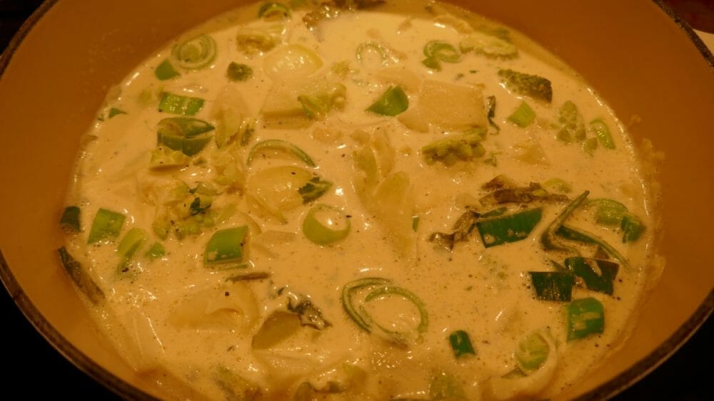 Rens romanesco og del den i buketter. Ha romanesco, løk, purre, vann og buljong i en kjele. Kok opp og la det koke til grønnsakene er møre.