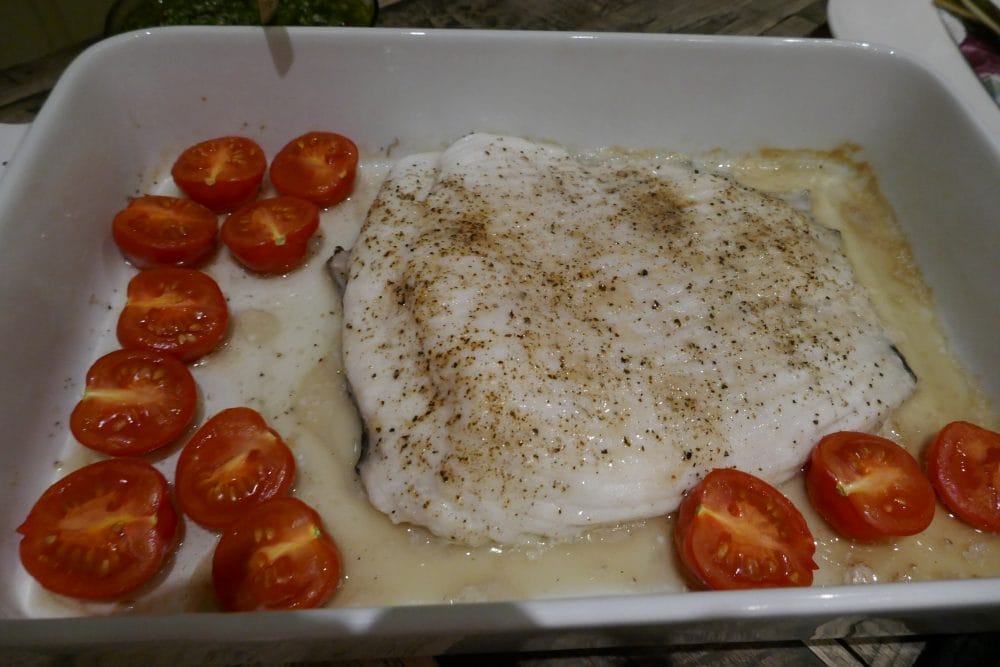 Risle en ildfast form med litt olje og legg skatevingen med skinnsiden ned. Legg i minitomater og krydre med salt og pepper. Sett formen i ovnen på 200 grader i 10-15 minutter, avhengig av tykkelsen vingen.
