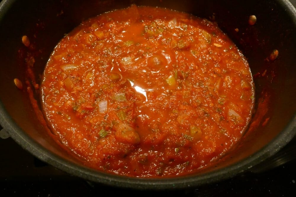Varm olje i en gryte over middels høy varme og stek paprika, løk og hvitløk til de er møre, i 5 til 7 minutter. Krydre blandingen med pepper, tilsett vin og la det koke noen minutter. Bland inn tomater, fond, persille, basilikum, oregano og chiliflak. Rør det sammen, kok opp, skru ned varmen og la det koke med lokk i 2 timer på lav varme, husk å røre av og til.
