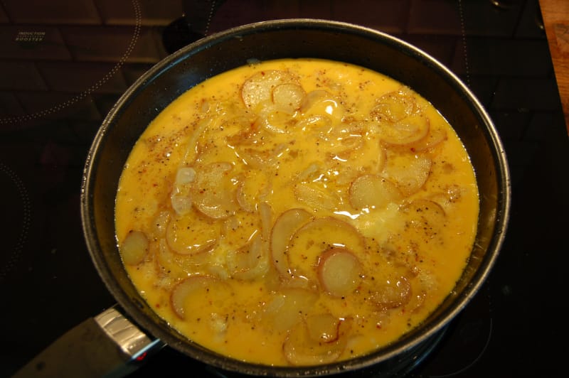 løken og potetene stekes på svak varme i olivenolje, til potetene er gjennomstekte. Snu på blandingen av og til, så den ikke brenner seg.