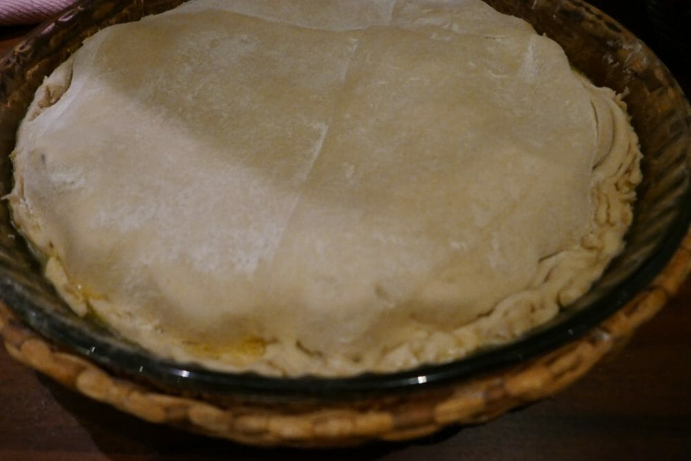 Dryss mel på benken og legg butterdeigplatene så de overlapper hverandre. Kjevle deigen så mye ut, at den er 2 cm større enn formen. Legg deigen over løken og klem den forsiktig ned rundt kanten. Plasser formen midt i ovnen på 200 grader og stek i 25-30 minutter, eller til butterdeigen har hevet og fått fin, gyllen farge.