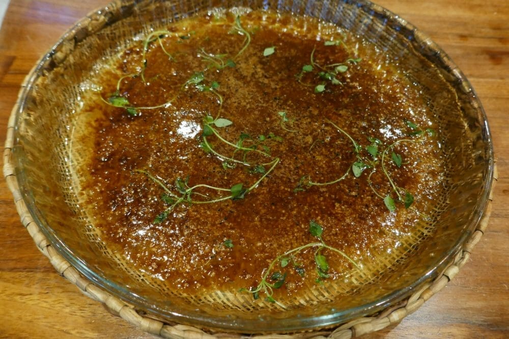 Hell sukker i en ildsfast form på ca. 22 cm, f.eks. paiform og smelt det til karamell på 200 grader i ovnen. Ta ut formen av ovnen og rør inn smøret. Tilsett timian, salt, pepper og balsamico. Det spruter litt, så vær forsiktig.