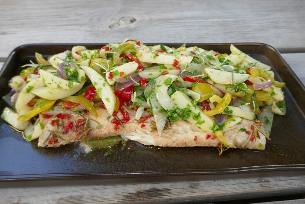 Når grønnsakene har bakt i 30 min., rører du godt rundt og setter inn fisken, dekket av fole ved siden av grønnsakene og baker videre i 30 min. til.
