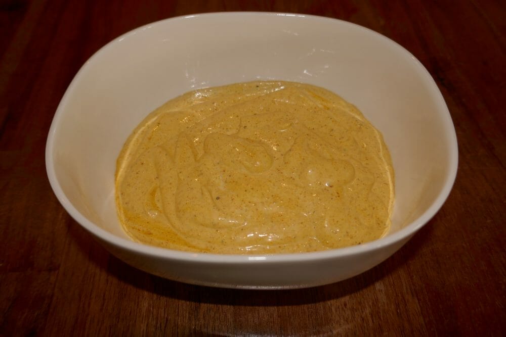 Bland alt sammen, smak til med salt og pepper og sett kaldt til den skal brukes.