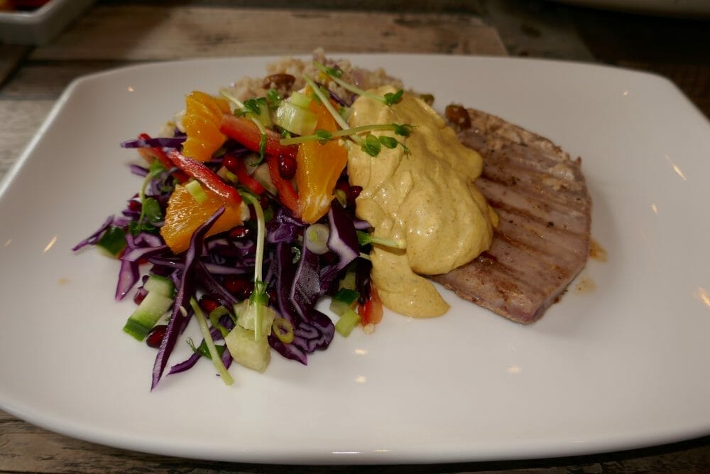 Tunfisk med couscous og salat serveres med en karri- og mangodressing og er inspirert av landene i Midtøsten. Om du får tak i tunfisk, kan den like gjerne lages med andre fiskeslag, som egner seg for steking eller grilling.
