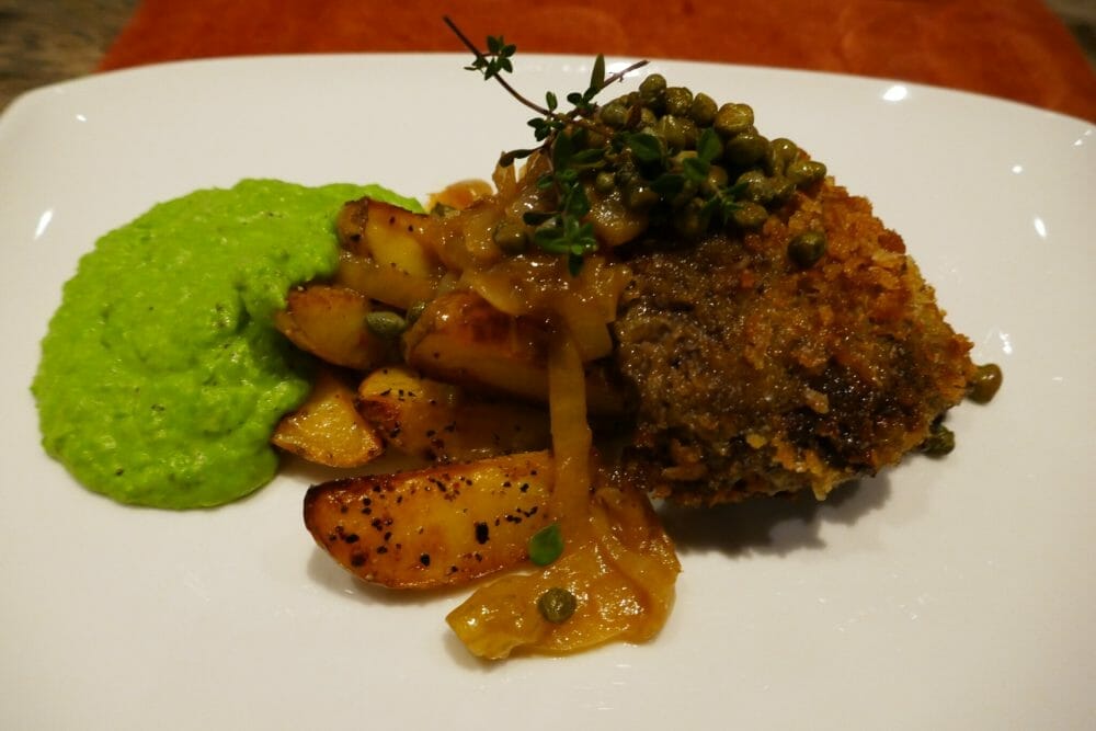 Hovedrett: Wallenbergare med ertepuré og båtpoteter
