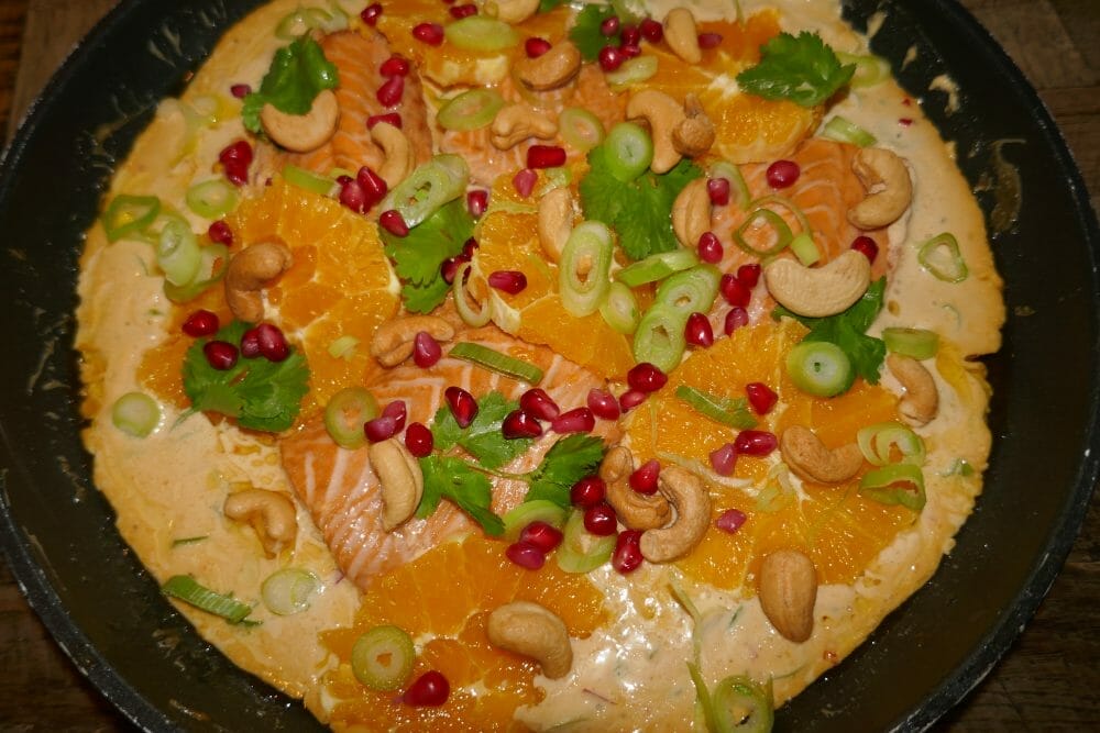 Laks med smak av Østen er en velsmakende rett som lages på tiden det tar å koke ris. Et tips når du skal få kjernene ut av granateplet, er å dele det i to, putte den ene halvdelen i en brødpose, holde posen lukket og slå på den fra utsiden. Da slipper du sprut over hele kjøkkenet. Du får også små plastbokser med ferdig rensede kjerner i flere butikker. Saltet i soyasausen gjør at du trolig ikke behøver ekstra salt.